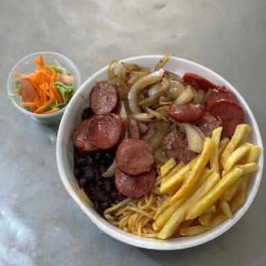 Arroz, feijão preto, macarrão, farofa com bacon, calabresa acebolada, batata frita e salada separada (opcional).