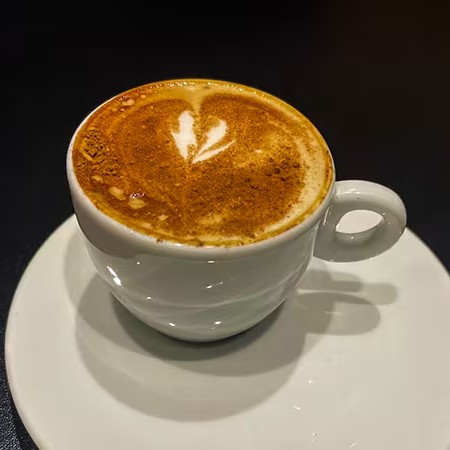 Leite vaporizado com uma dose de expresso, cacau e canela.