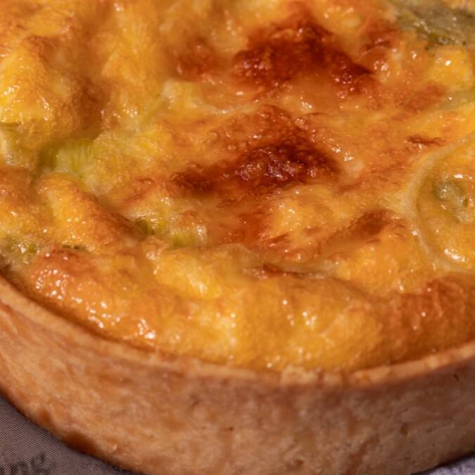 Massa leve e amanteigada recheada com creme de ovos e alho poró.