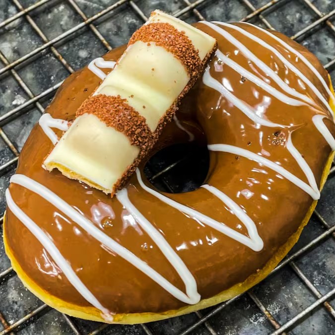 Donut com cobertura de chocolate ao leite e pedaço de Kinder Bueno. Crocante, cremoso e absurdamente delicioso. (Imagem meramente ilustrativa)