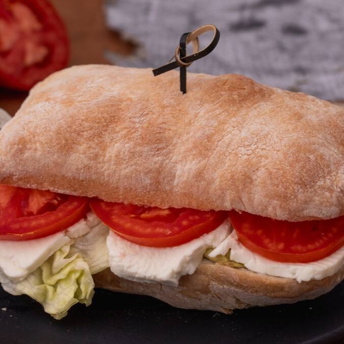 Pão ciabatta com patê de tomate seco, rúcula fresca, mussarela de búfala e rodelas de tomate seco. Um clássico italiano.