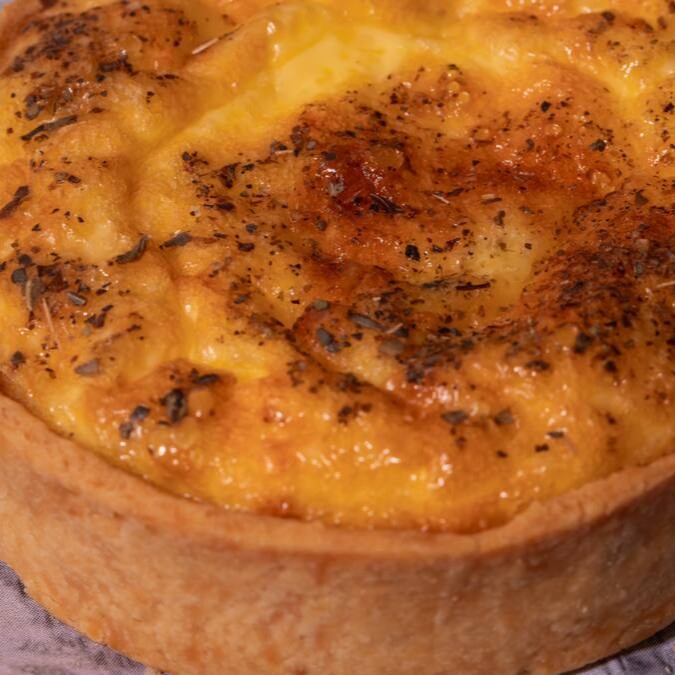 Massa leve e amanteigada recheada com creme de ovos e queijo, finalizada com pedaços generosos de bacon crocante.