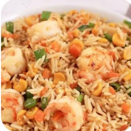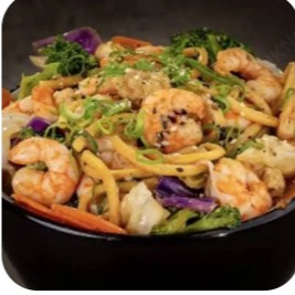 Aprecie o yakimeshi de camarão, acompanhado de arroz, uma combinação perfeita de sabores para os amantes de frutos do mar.