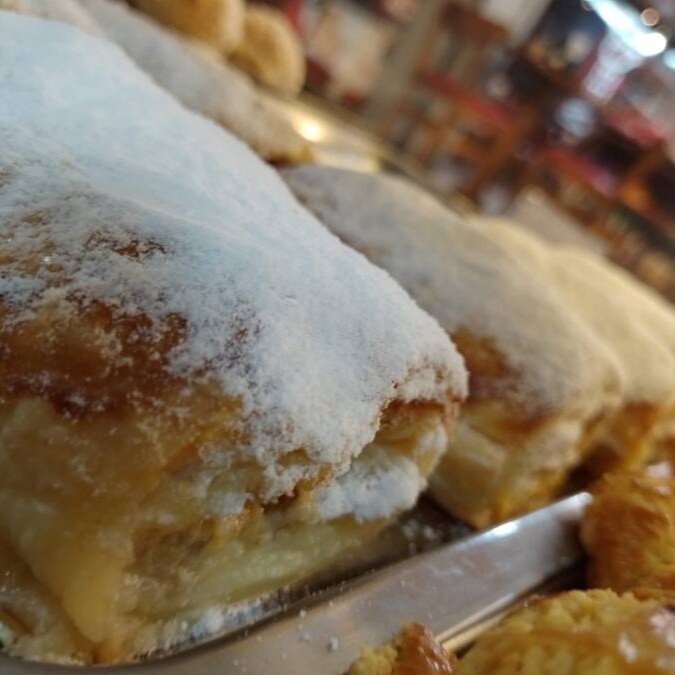 Massa folhada, recheio, açucar gelado.