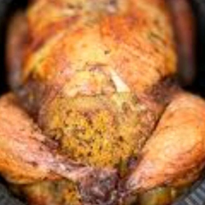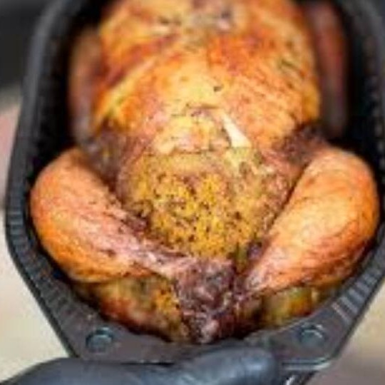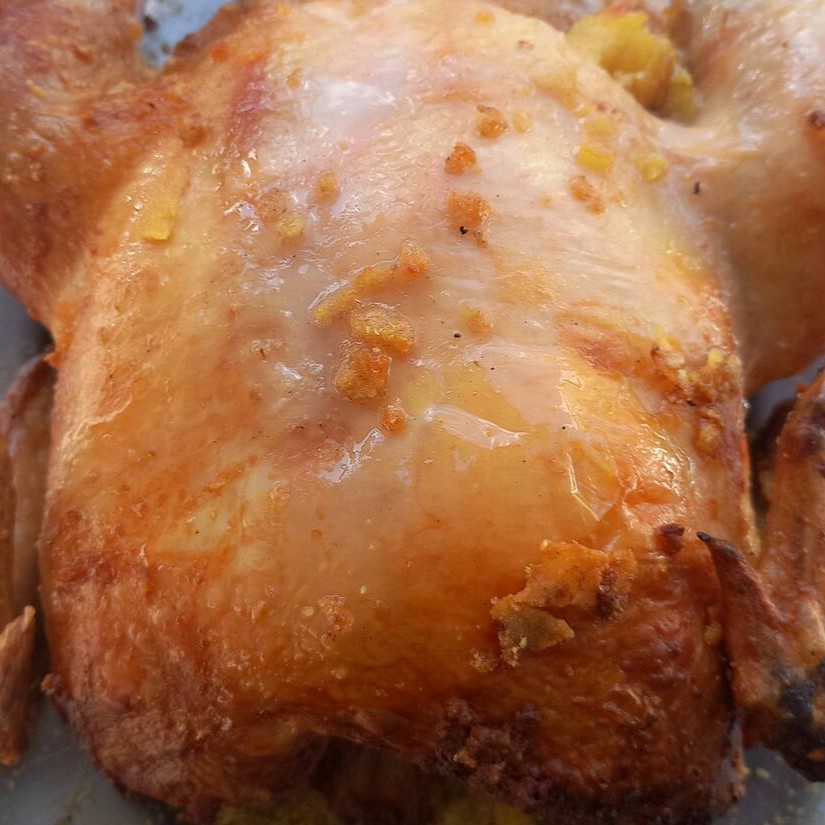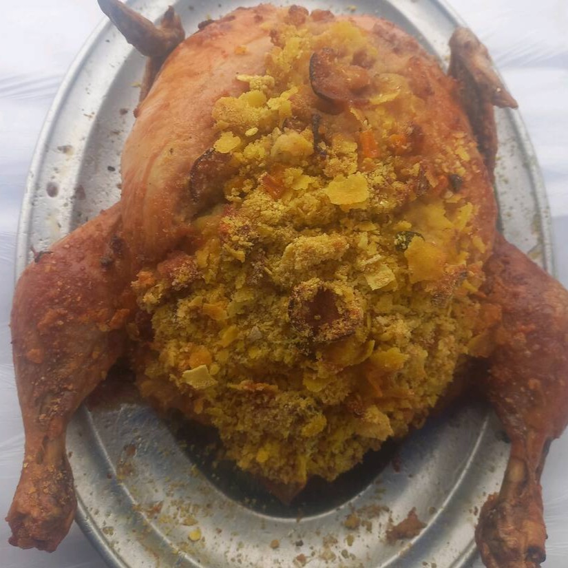 Frango aberto .farrrofa com 2 tipos de farinha ,calabresa ,beycon,milho,azeitona,etc