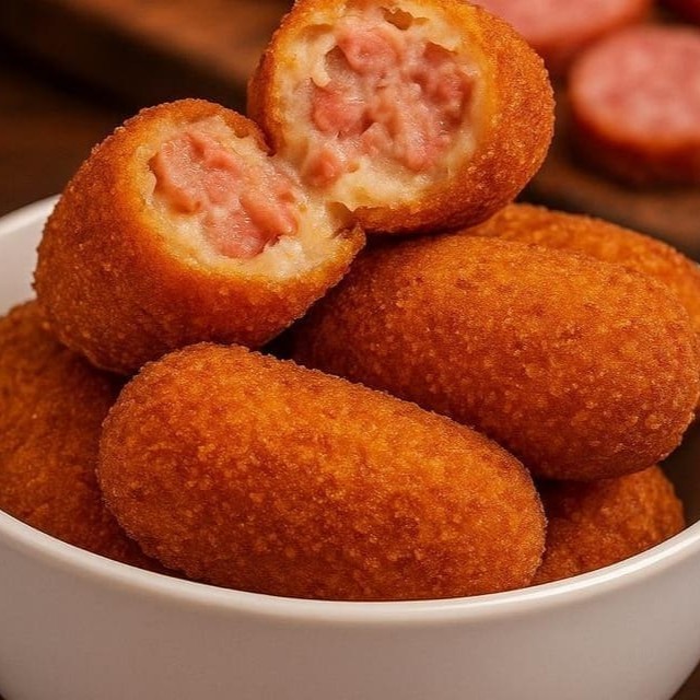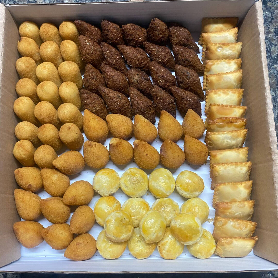 Combo com 100 salgados, sendo 20 coxinhas, 20 bolinhas de queijo, 10 kibes, 10 Enroladinhos de salsicha, 10 Croquete de calabresa, 20 risoles de carne, 10 Croquete de queijo e presunto