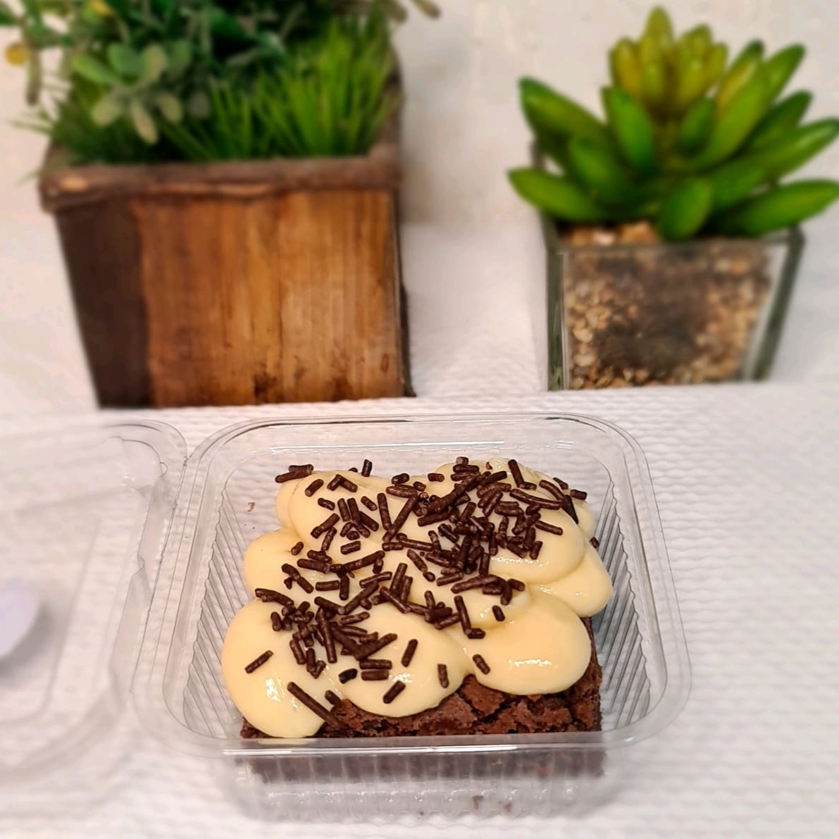 Desfrute de um irresistível Brownie coberto com os maravilhosos creme de leite Ninho e creme de brigadeiro. Cada mordida é uma verdadeira explosão de sabor. Com um peso aproximado de 180g, este brownie é a indulgência perfeita para qualquer momento do Dia.