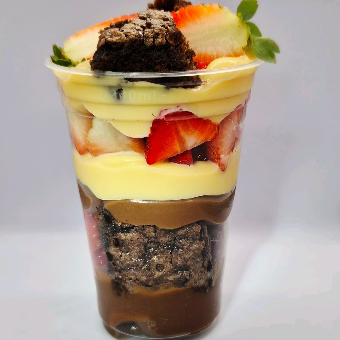 Nosso copo da felicidade de morango e brownie é composto por creme de brigadeiro, creme de Ninho, brownies e morangos frescos. Peso aproximado: 320g.
