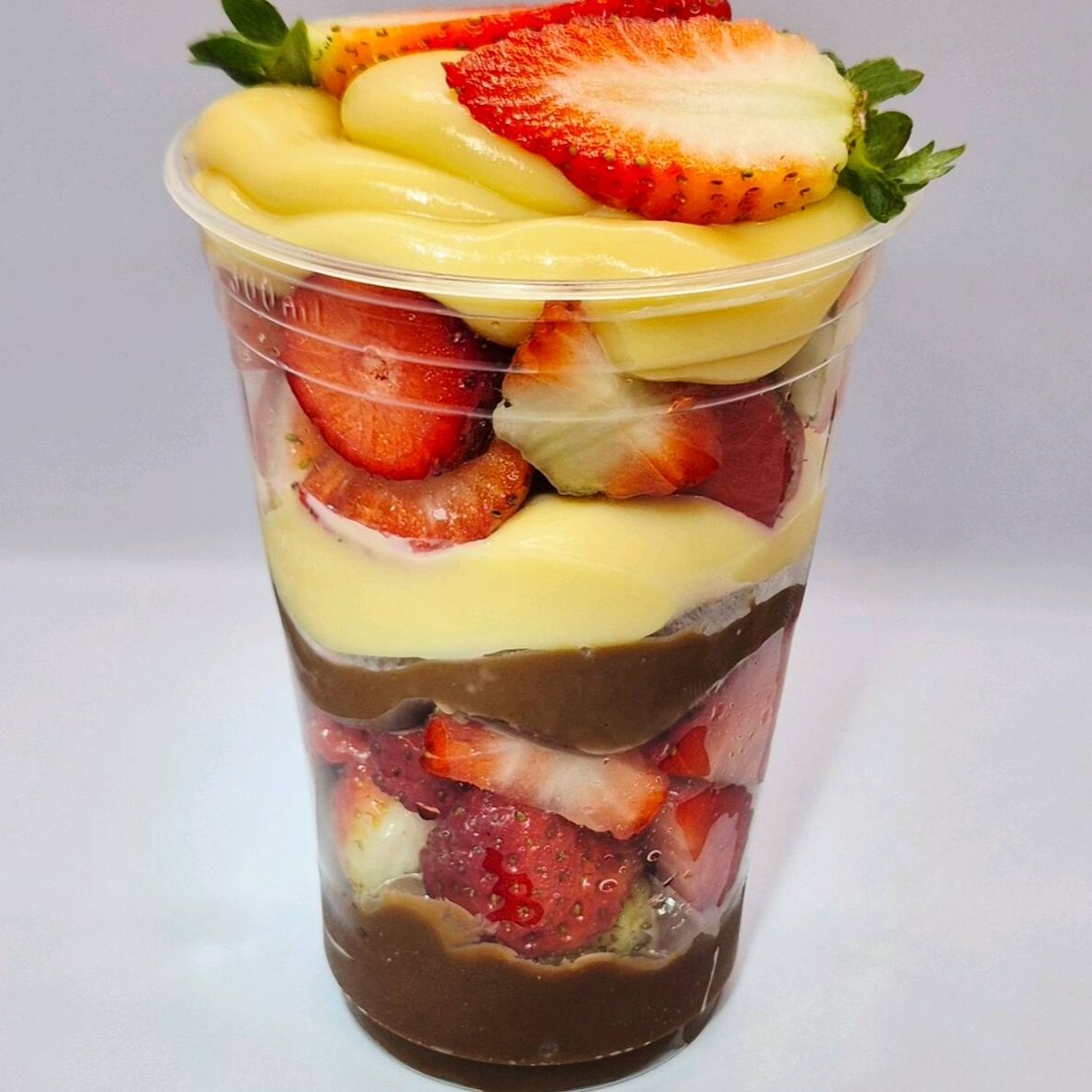 Nosso copo da felicidade de morango é composto por creme de brigadeiro, creme de Ninho e morangos frescos. Peso aproximado: 320g.