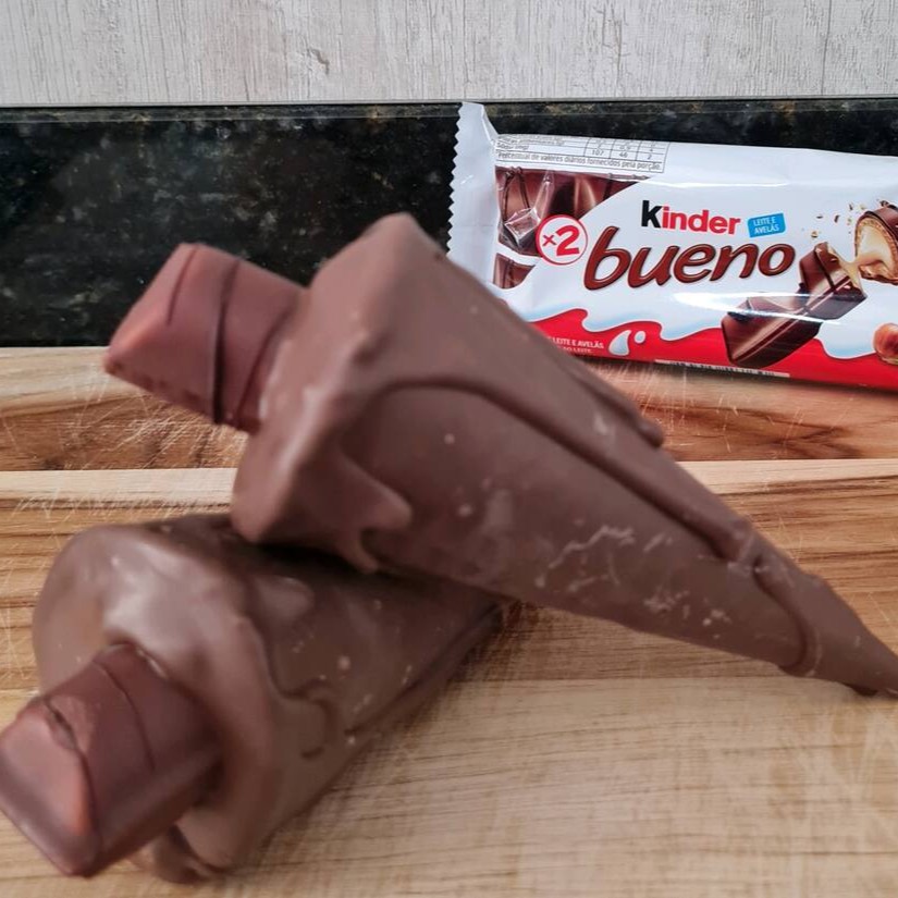 Deliciosa casquinha super crocante, banhada no chocolate ao leite, recheado com delicioso chocolate cremoso e biscoito Kinder Bueno.