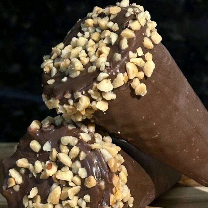 Deliciosa casquinha super crocante, banhada com chocolate ao leite, recheada com chocolate e amendoim torrado.