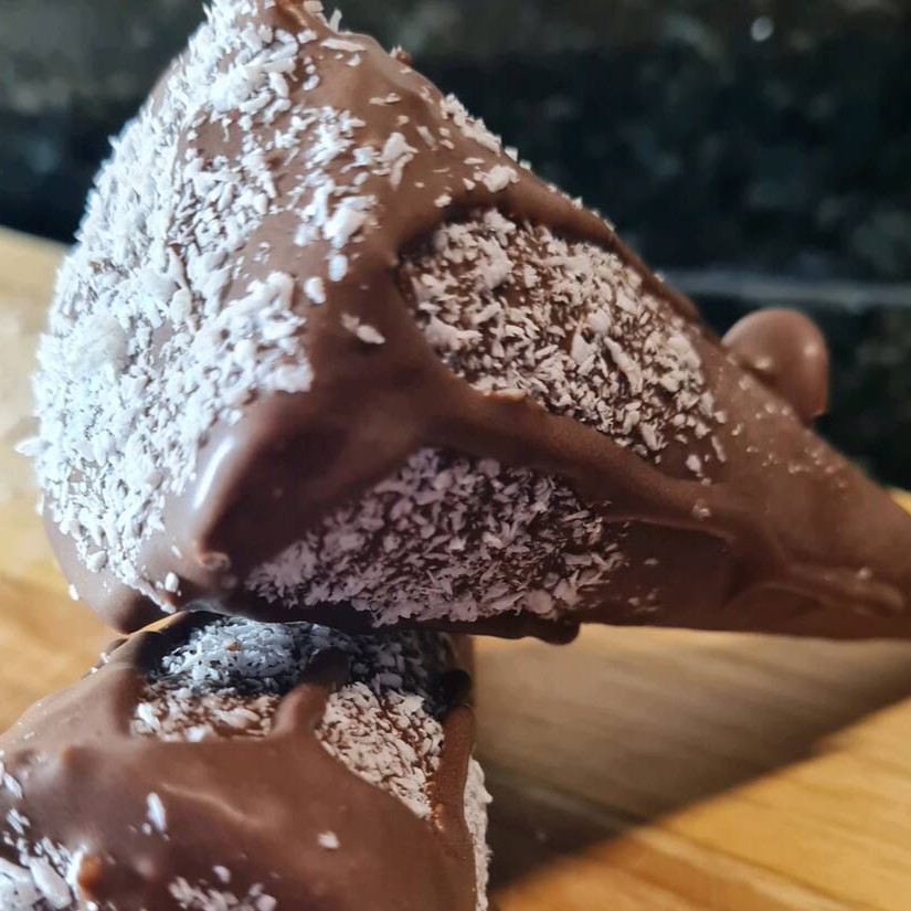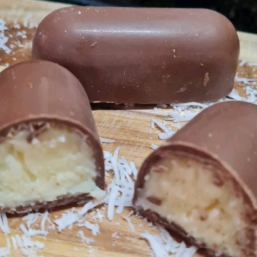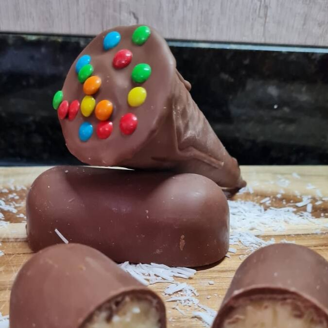 Deliciosa casquinha super crocante, banhada no chocolate ao leite, recheada com chocolate e côco ralado.