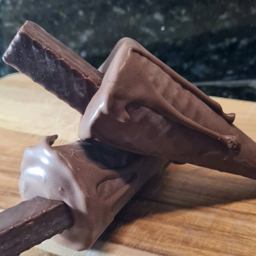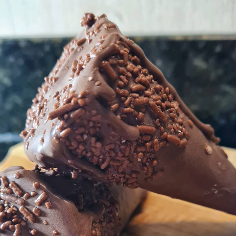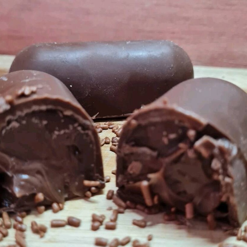 Deliciosa casquinha super crocante, banhada no chocolate ao leite recheado com chocolate brigadeiro.