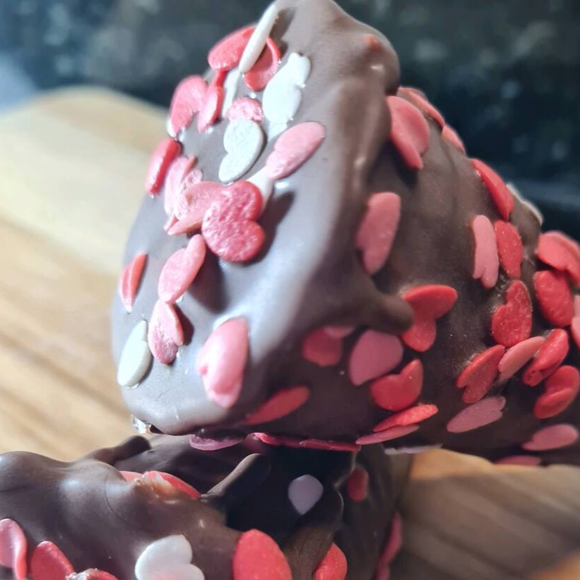 Deliciosa casquinha super crocante, banhada no chocolate ao leite, recheada com chocolate branco e preto, e corações coloridos.