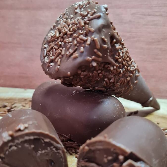 Delicioso bombom de chocolate ao leite, recheado com creme de chocolate, granulado de chocolate.