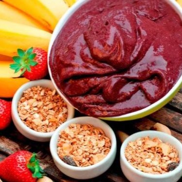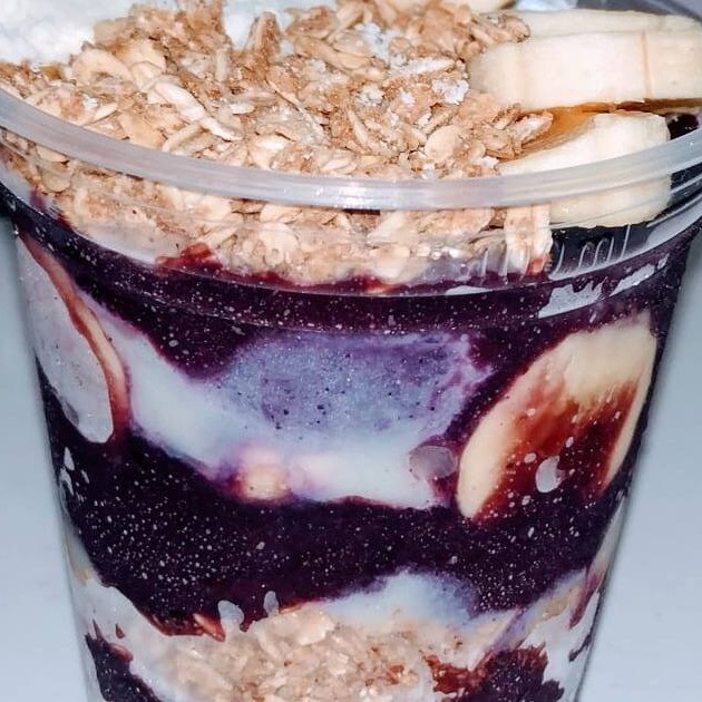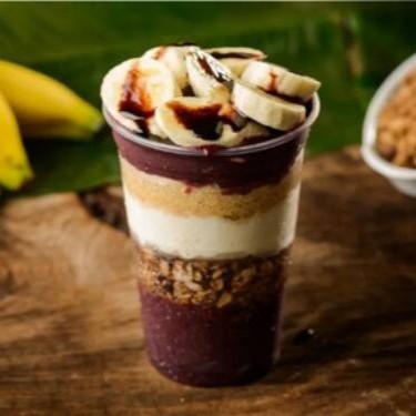 Açai cremoso, Granola, Leite condensado, Leite em pó e Banana.