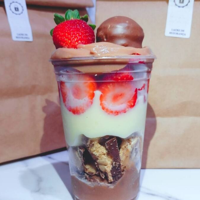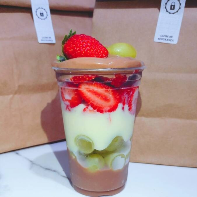 Açai cremoso, Granola, Leite condensado, Leite em pó e Morangos