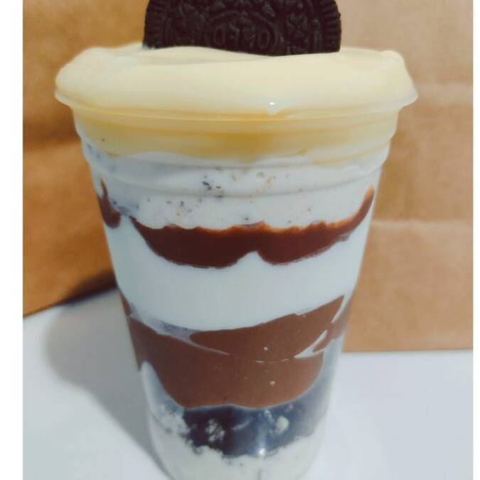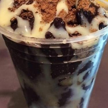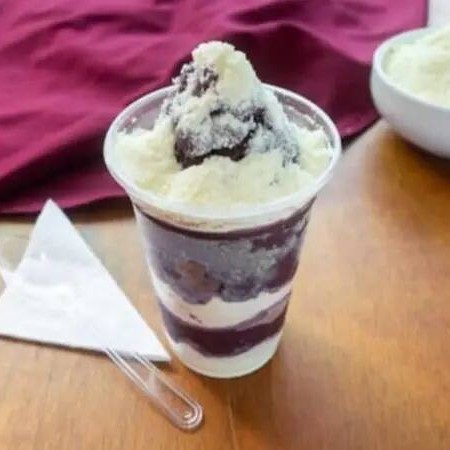 Açai cremoso,banana,leite condensado,leite em po, granola.