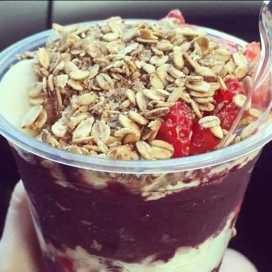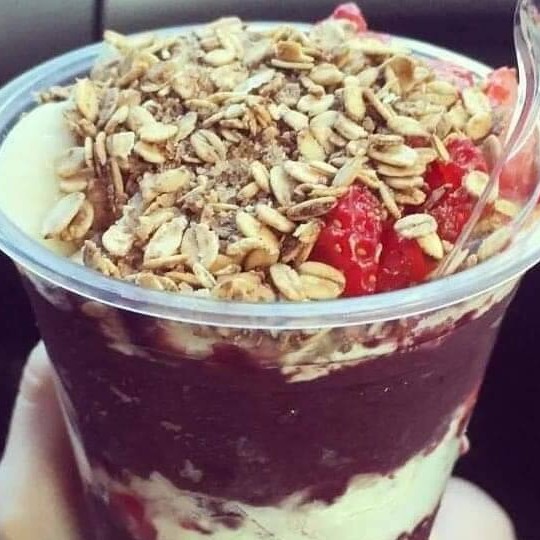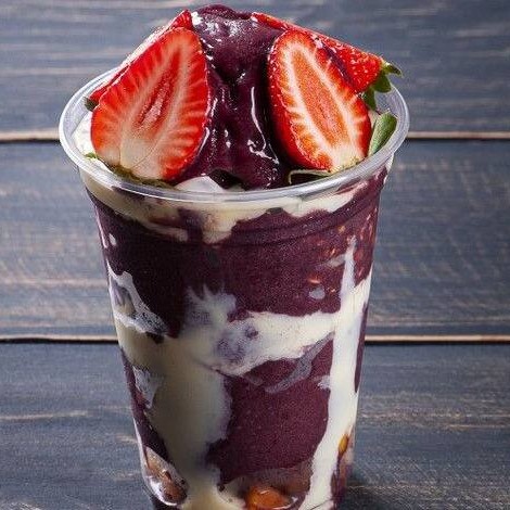Açai cremoso, Morango, leite condensado e leite em pó e granola.