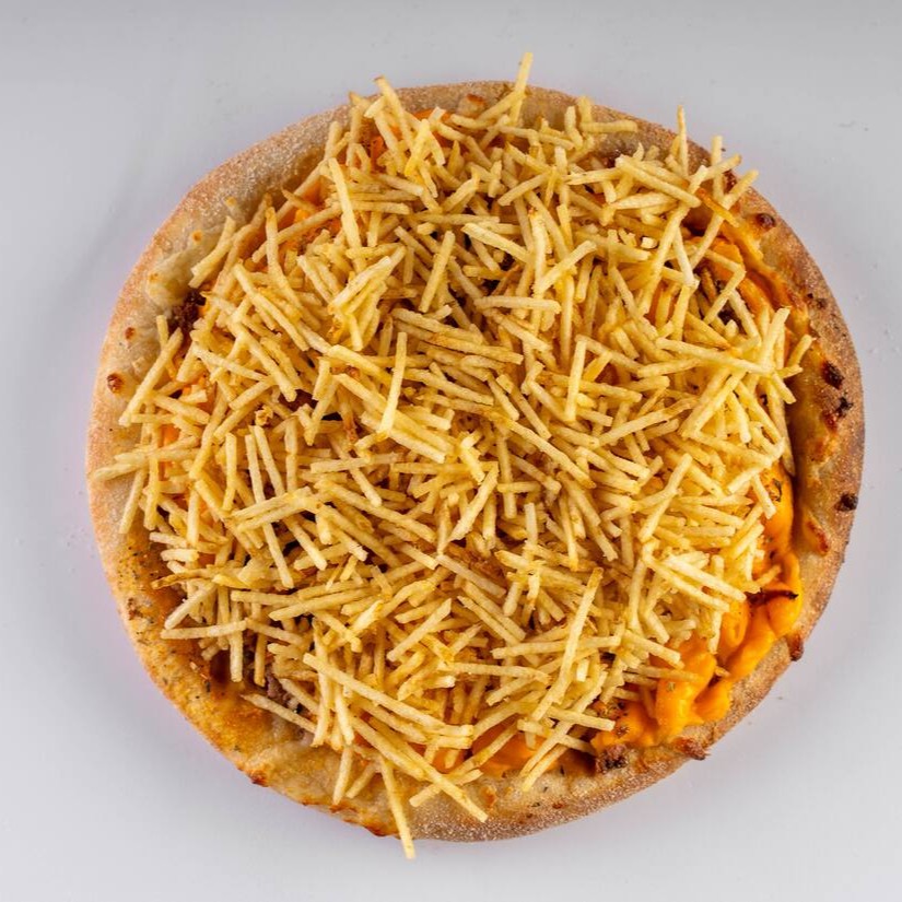 Molho artesanal da vovó, queijo muçarela ralado, carne moída especial com tempero da vovó, camada de cheddar, orégano , coberta de batata palha