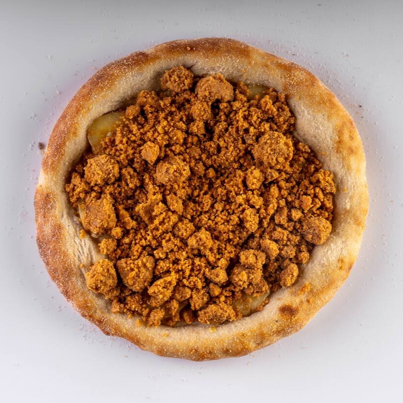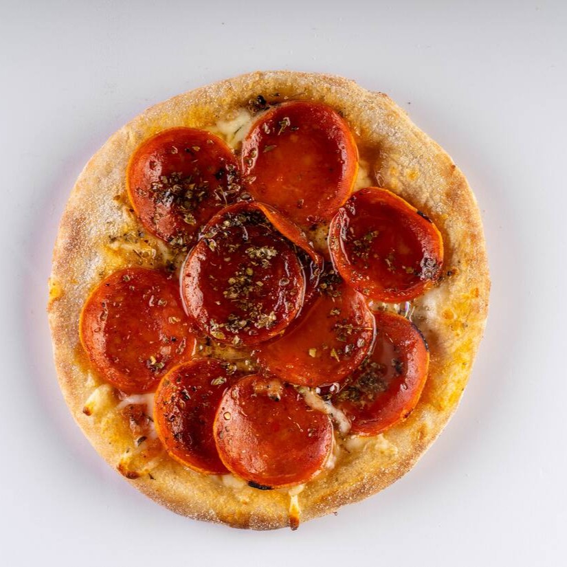 Massa vegana, molho artesanal da vovó, queijo mussarela, calabresa moída e orégano