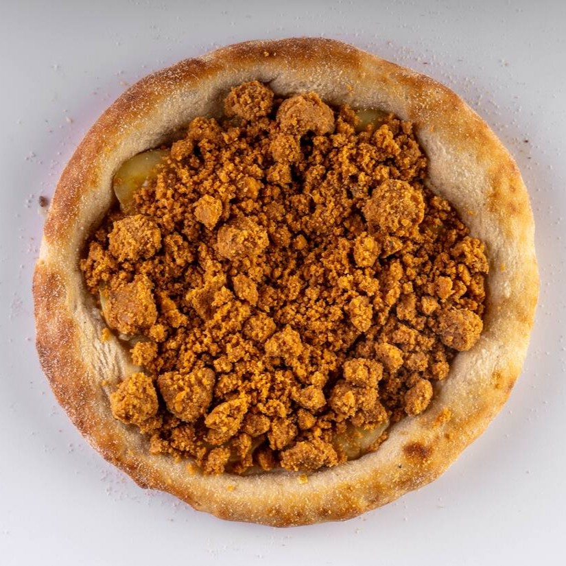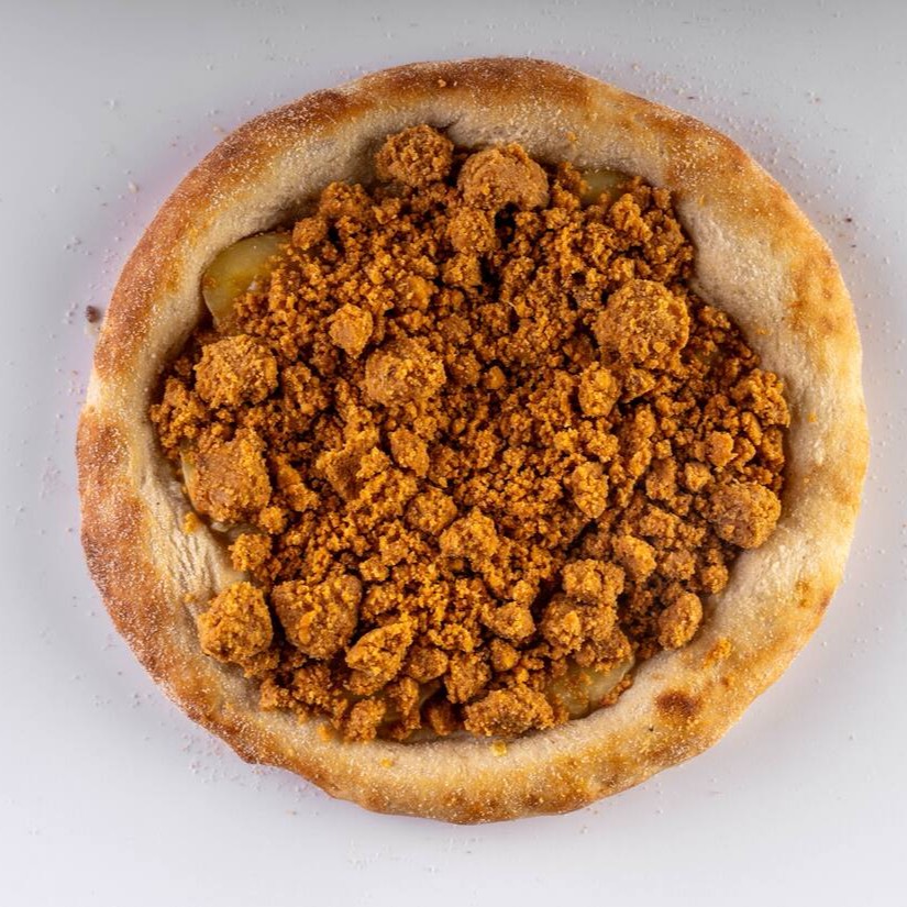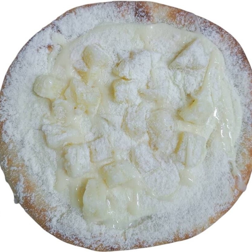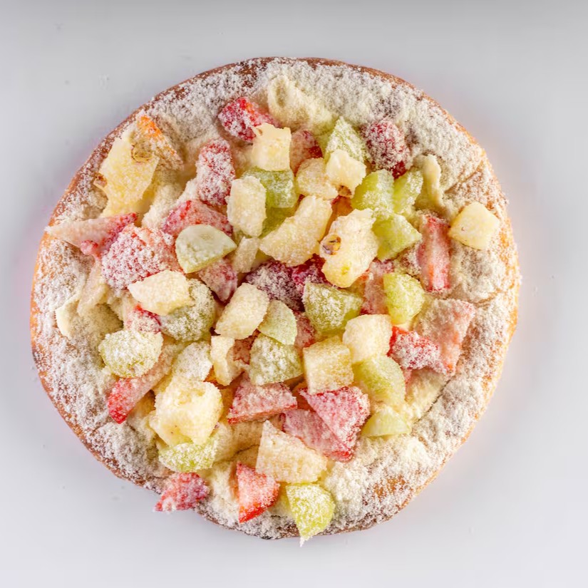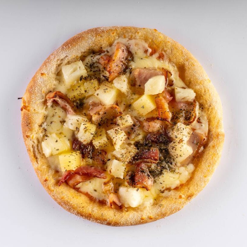 Molho artesanal da vovó, queijo muçarela ralado , bacon em cubos, e abacaxi natural finalizada com orégano