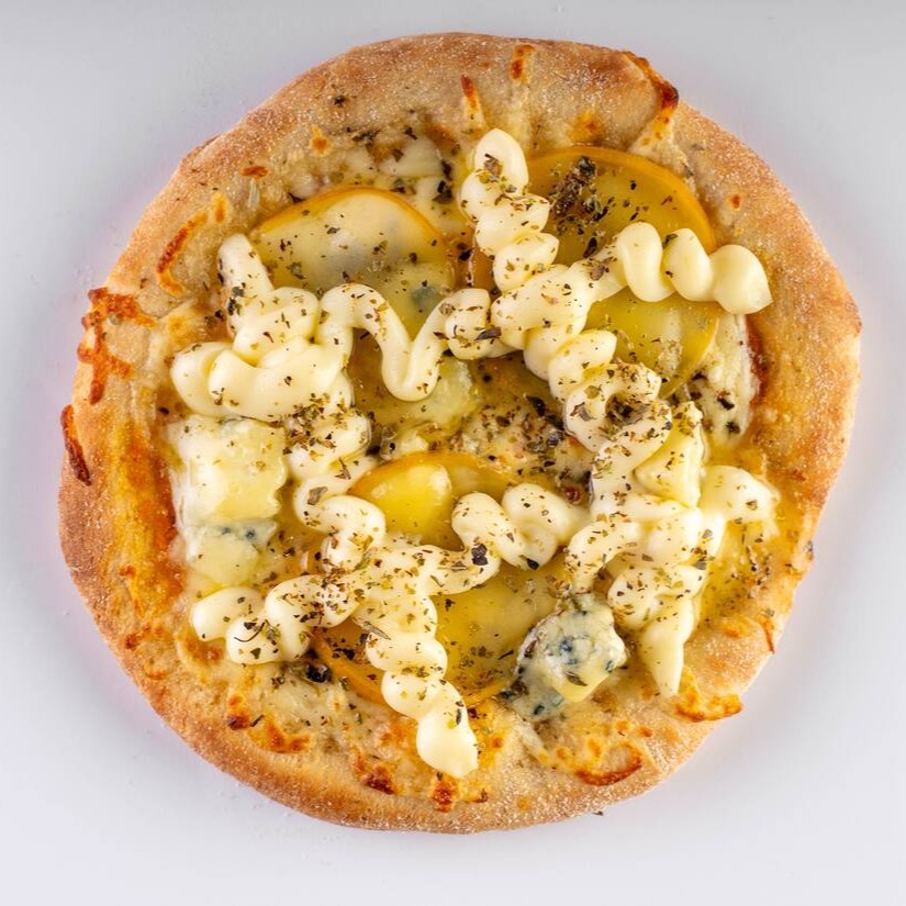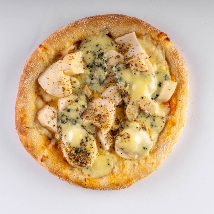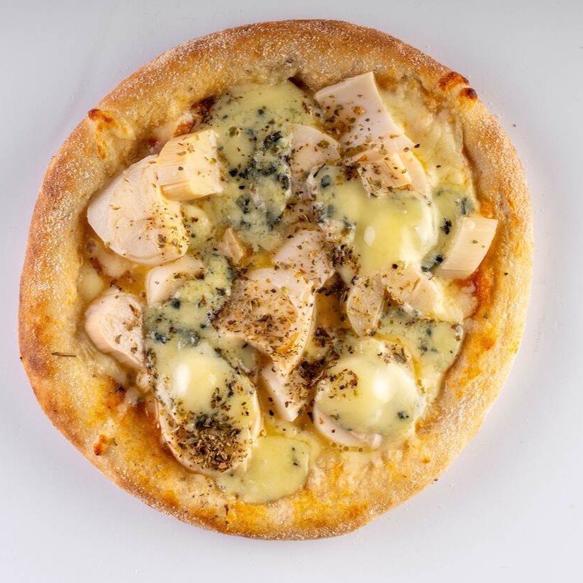 Molho artesanal da vovó, queijo muçarela ralado, toras de palmito, com lascas de gorgonzola finalizada com orégano,