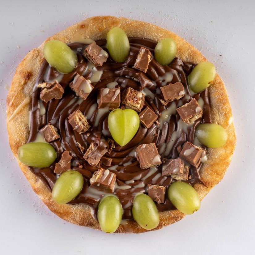 Creme de leite e coberta com chocolate ao leite, Kit Kat partidos, uvas verdes fatiadas e finalizada com fios leite condensado