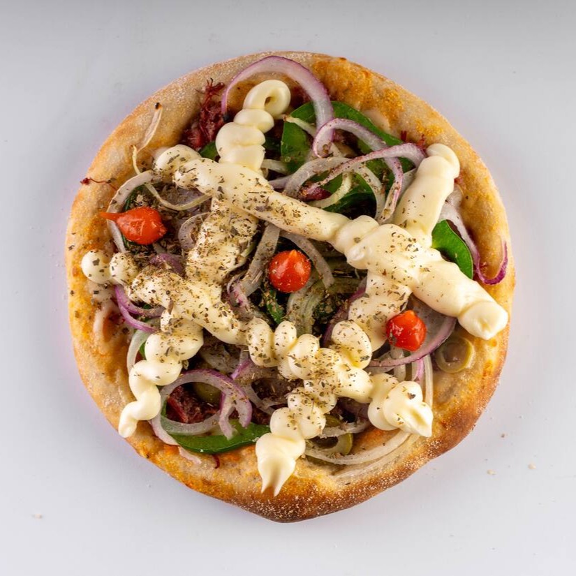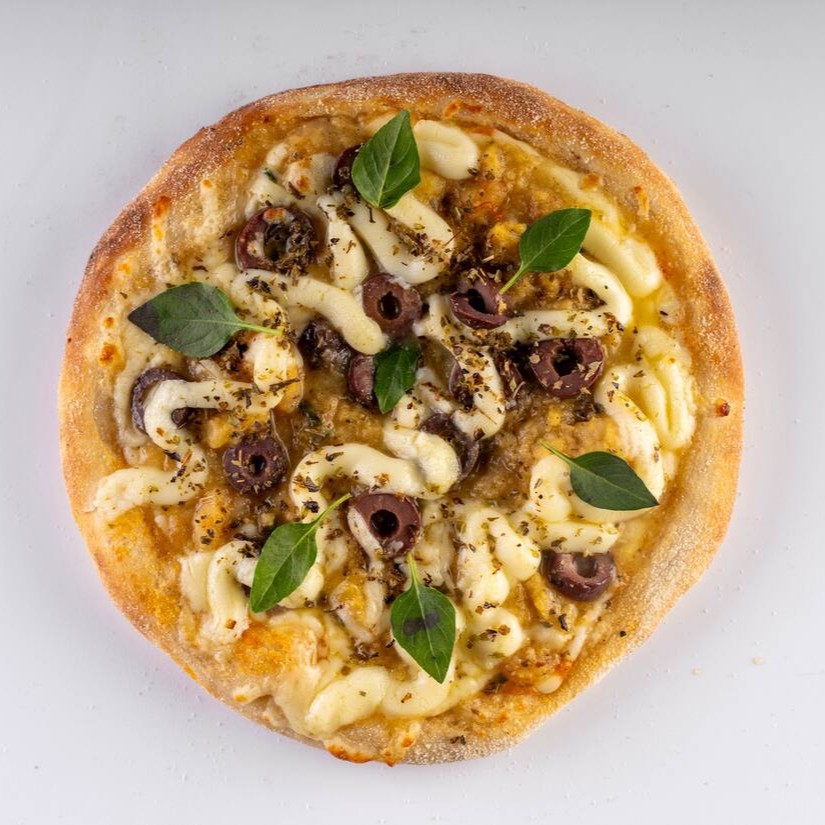 Massa vegana, molho artesanal da vovó, queijo, calabresa, Catupiry e cebola