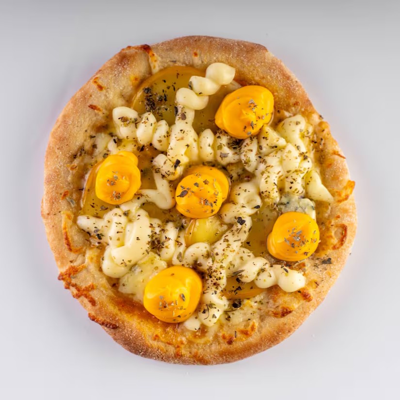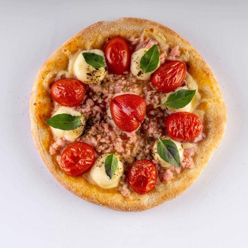 Molho artesanal da vovó, queijo muçarela ralado, presunto ralado, tomatinho cereja, Catupiry Original ou cream cheese manjericão, e orégano