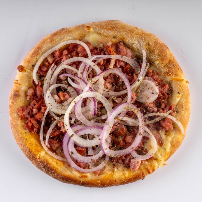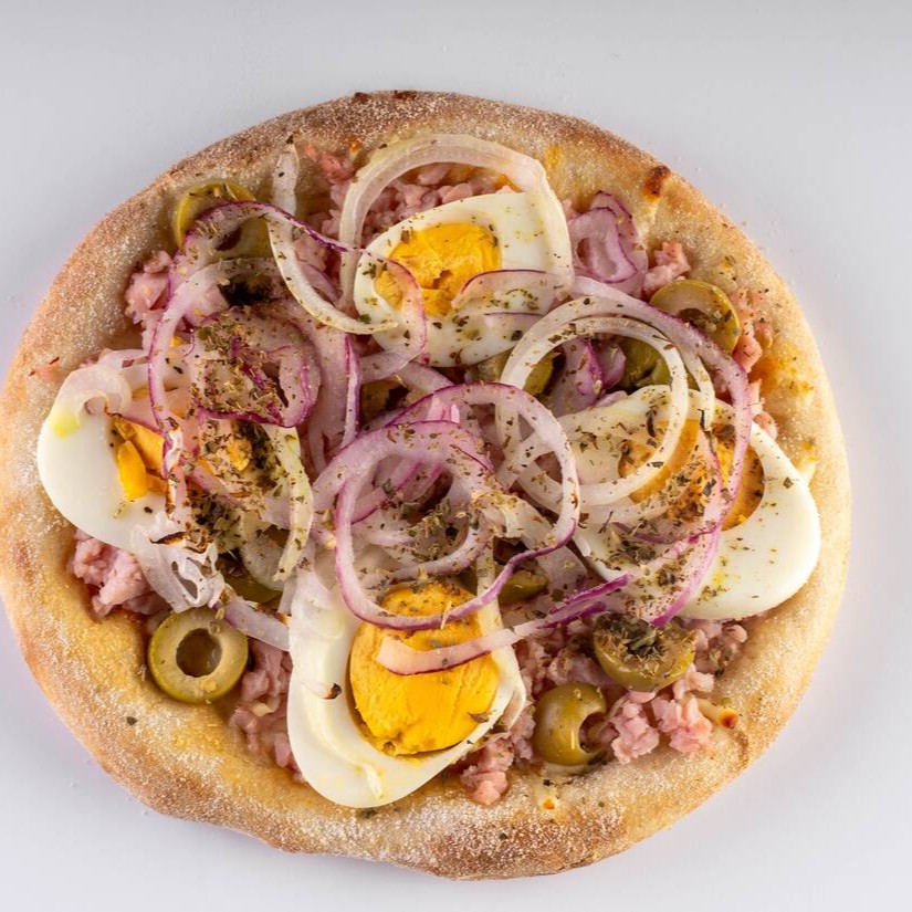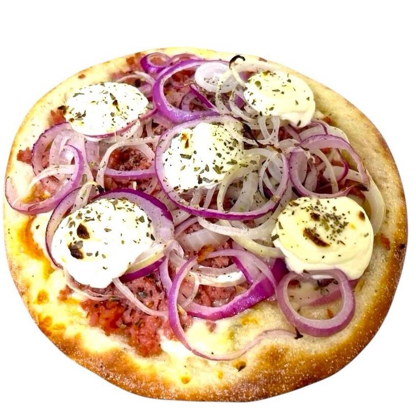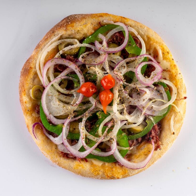 Molho artesanal da vovó, queijo muçarela ralado, carne seca de qualidade, rodelas de pimentão, mix de cebola roxa e branca azeitona verde, pimenta biquinho, finalizada com orégano