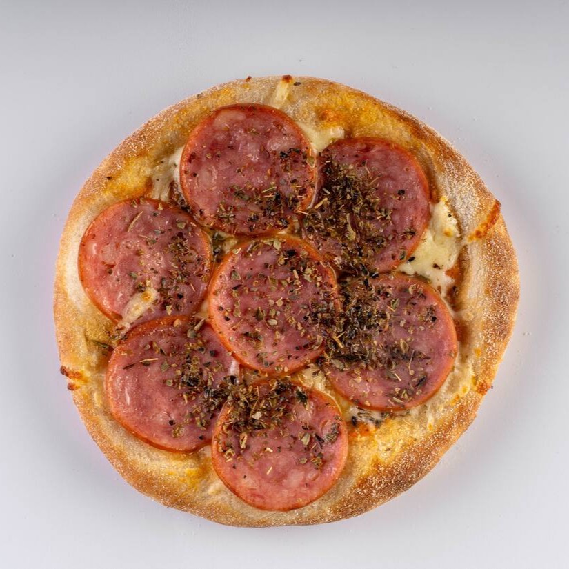 Massa vegana, molho artesanal da vovó, queijo mussarela, calabresa fatiada e orégano