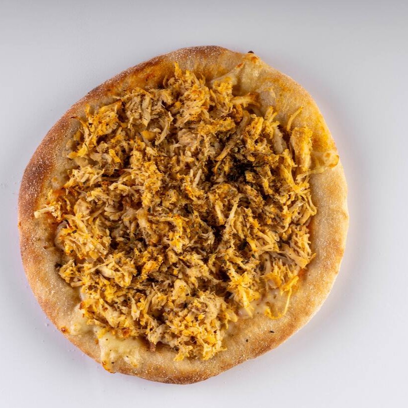 Massa vegana, molho artesanal da vovó, queijo mussarela, frango, e orégano