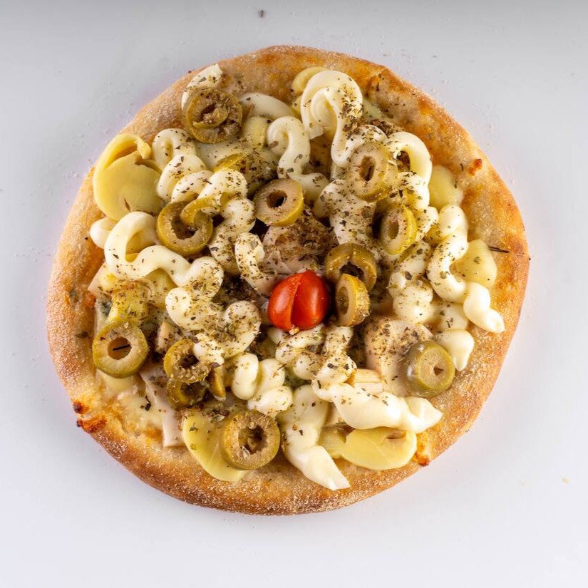 Molho artesanal, mussarela, frango, palmito, orégano