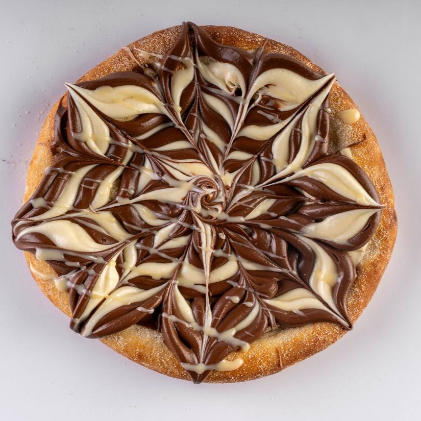 Creme de leite e coberta com chocolate ao leite e chocolate branco, finalizada com fios leite condensado