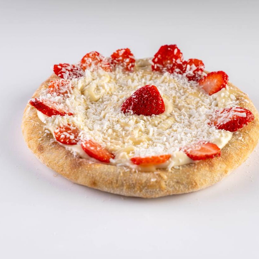 Creme de leite e coberta com chocolate branco, morangos frescos fatiados, coberto com coco ralado finalizada com fios de leite condensado