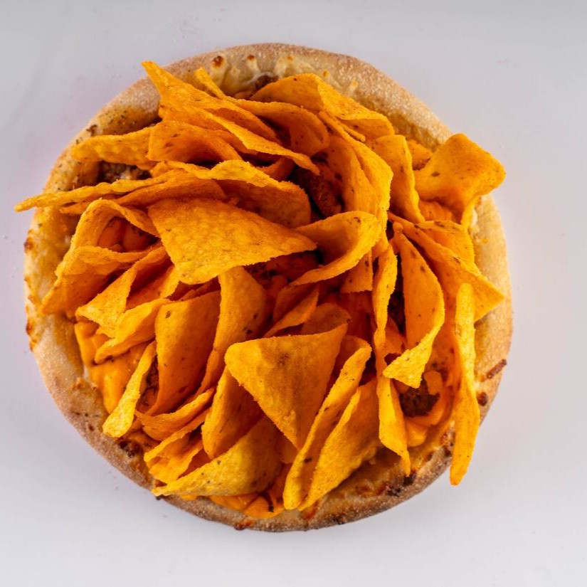 Molho artesanal da vovó, queijo muçarela ralado, carne moida especial com tempero da vovó, cheddar, oregano coberto com Doritos Original