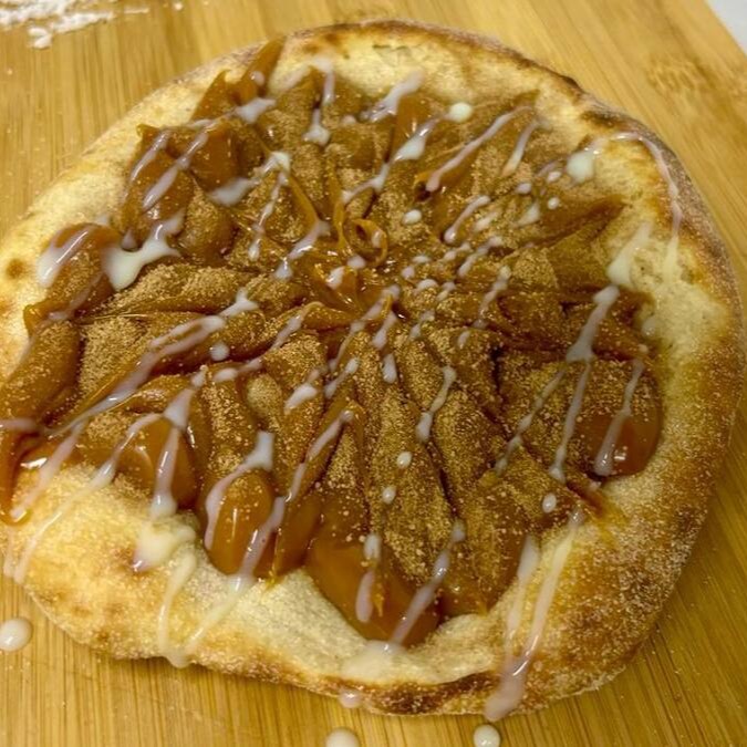 Molho artesanal da vovó, queijo muçarela ralado, peperone fatiado coberto com mel