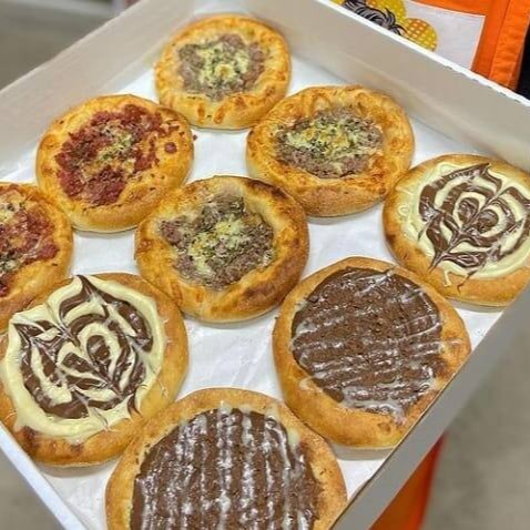 09 mini esfihas de 9 cm - 02 de frango, 02 de calabresa, 02 de queijo e 01 de chocolate ao leite, 01 de chocolate branco, 01 de dois amores