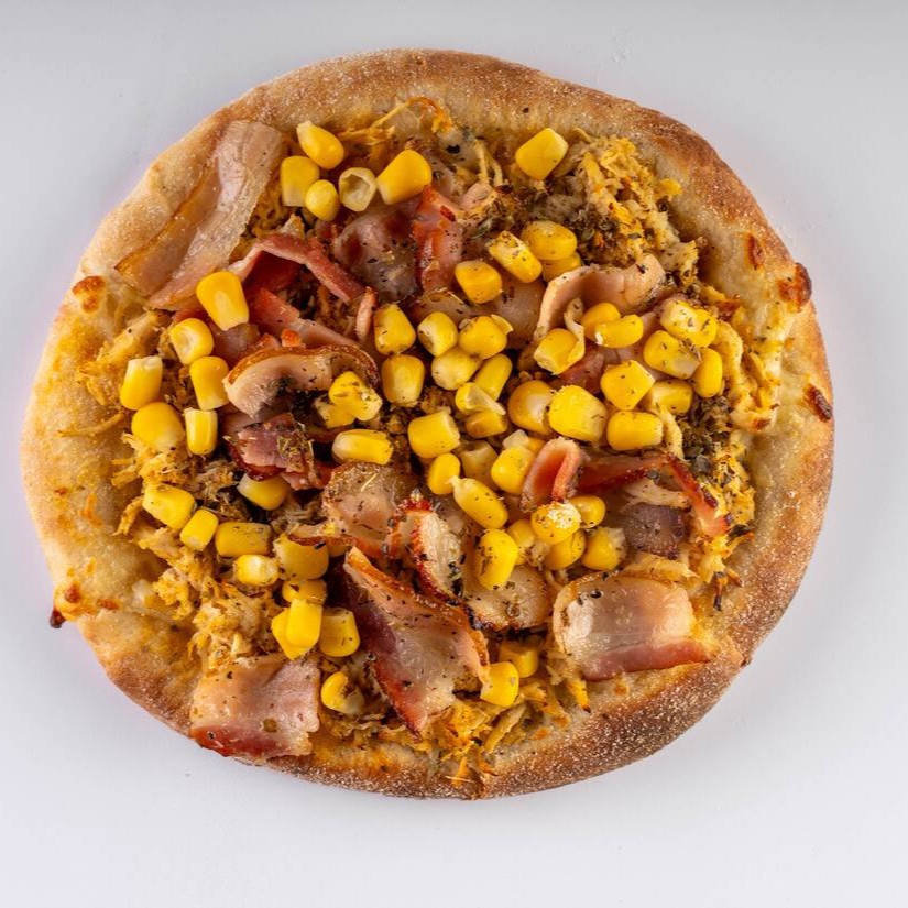 Molho artesanal da vovó, queijo mussarela ralado, milho verde, e bacon em cubos finalizada com orégano