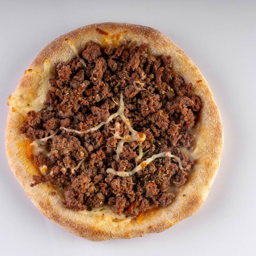 Massa vegana, molho artesanal da vovó, queijo mussarela, carne moída e orégano
