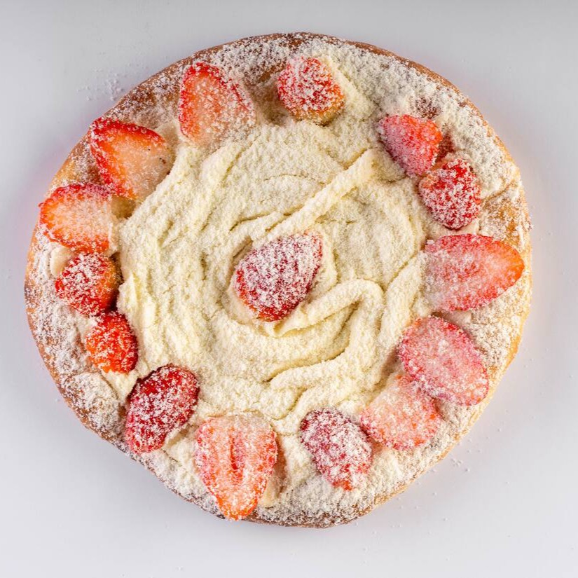 Creme de leite, coberta com creme de leite Ninho, leite em pó e morangos frescos fatiados finalizado com fios de leite condensado