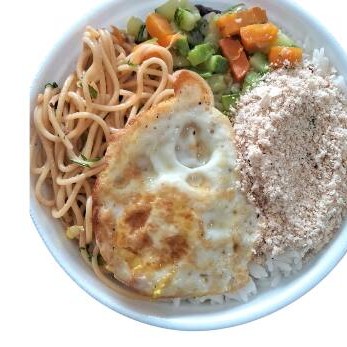 Na marmita acompanha Arroz branco, Feijão preto, macarrão, mix de legumes, farofa e ovo frito.
