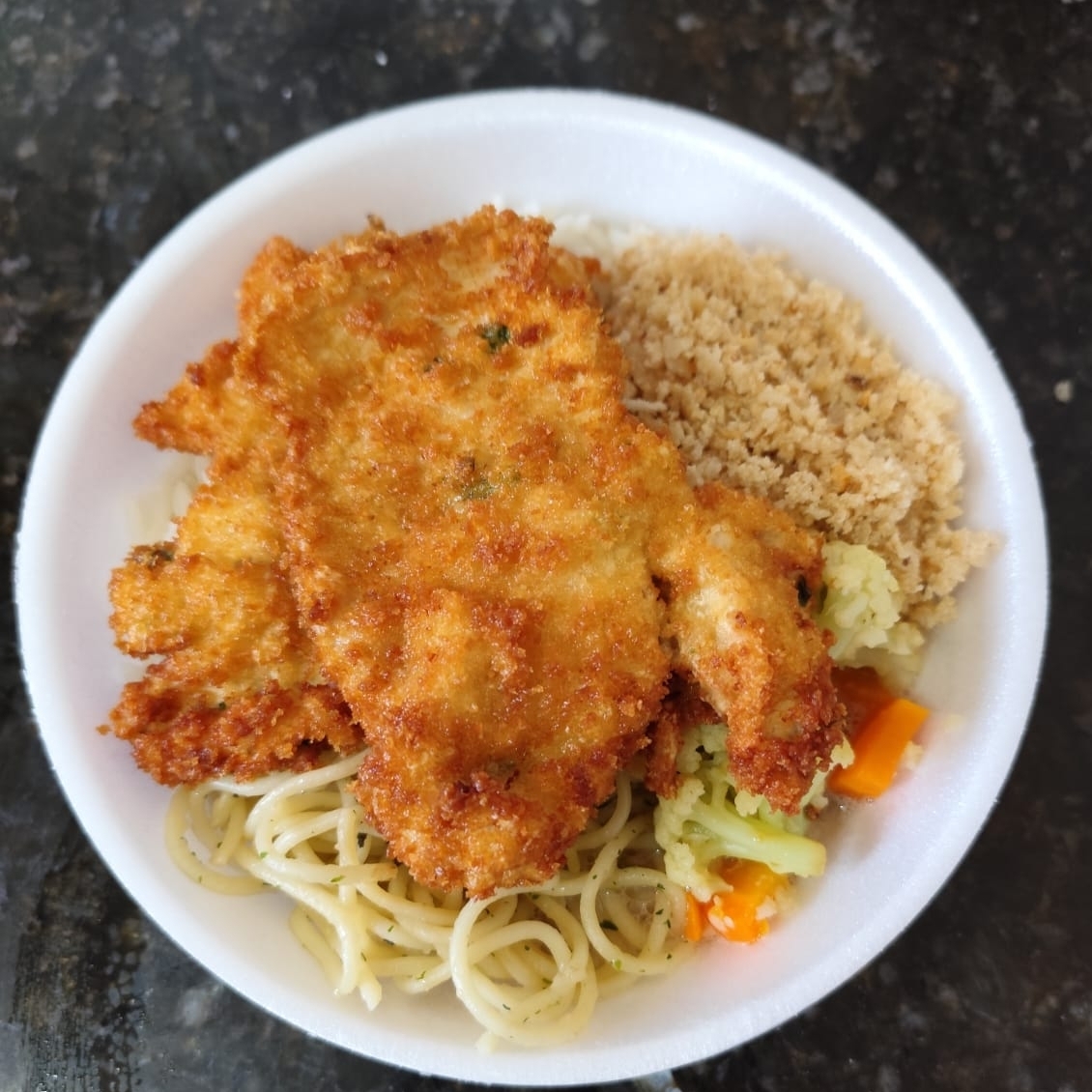 Arroz, feijão, mix de legumes, macarrão, farofa, tilápia milanesa.