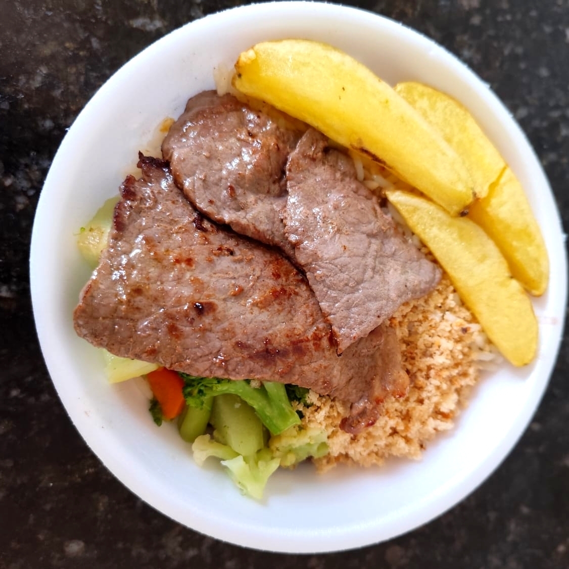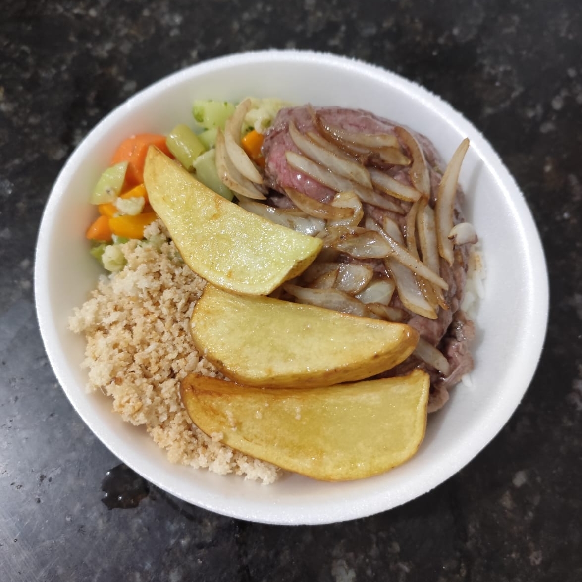 Arroz, Feijão, Farofa, mix de legumes, batata rústica, bife acebolado