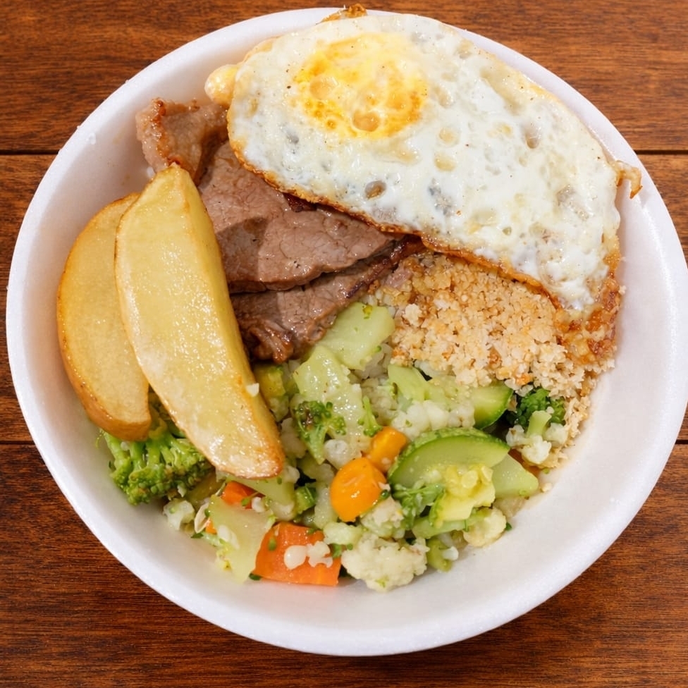 Arroz,Feijão,Farofa,mix de legumes, batata rústica,bife grelhado com ovo.