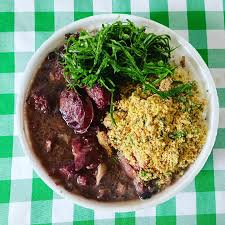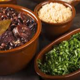 feijoada nobre completa, acompanha arroz branco, farofa, vinagrete, couve refogada, banana milanesa, torresmo e laranja