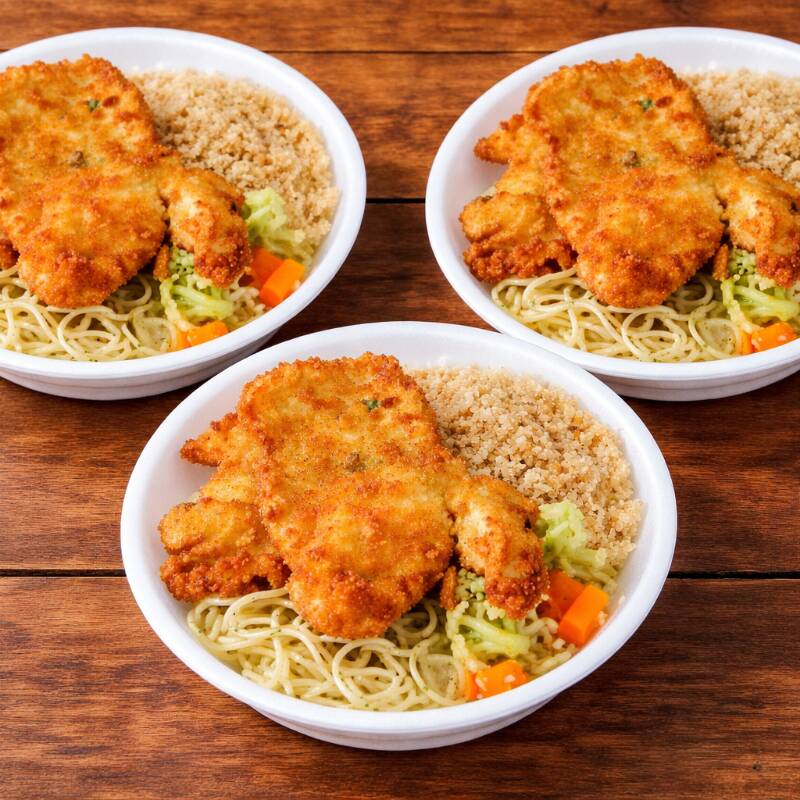 Arroz branco, feijão preto,mix de legumes, macarrão, farofa, frango à milanesa