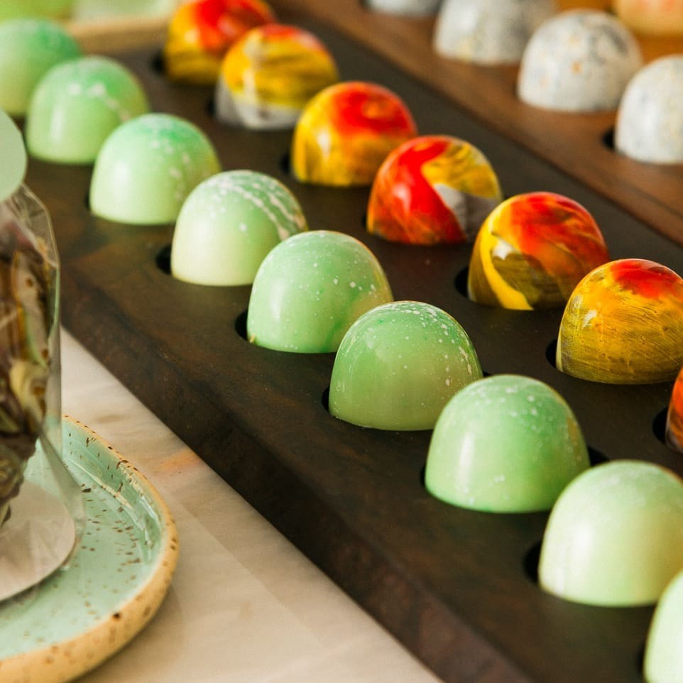 Casquinha de chocolate branco, recheado com caramelo de maracujá. *Todos os nossos bombons são artesanais, pintados à mão e feitos para consumo imediato.