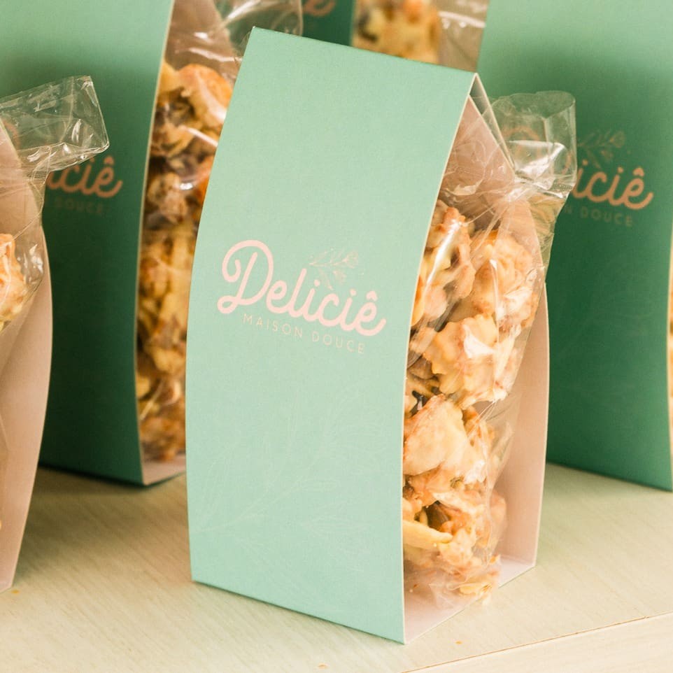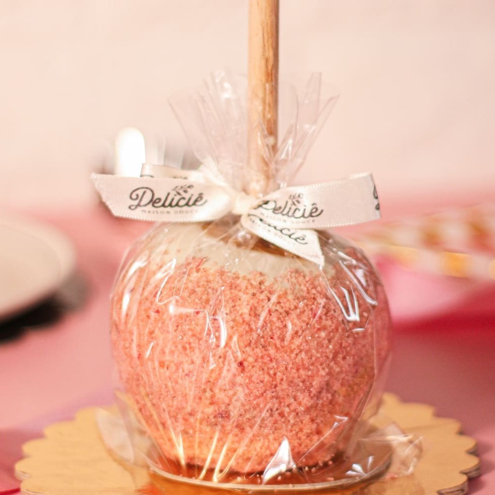 Maçã verde coberta com nosso caramelo artesanal, chocolate branco e uma farofinha de frutas vermelhas.